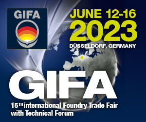 | Advertisement | | GIFA 2023 presents a wide range of products for the foundry sector from around the globe. Three thematically related trade fairs – METEC (metallurgy), THERMPROCESS (thermo processing) and NEWCAST (casting products) - are held concurrently, forming the “The Bright World of Metals”. |