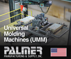 Advertisement | | 3X Higher Productivity. Up to 20 Molds/HR with One Operator! Reduced Costs – No Rollover Needed. UMM Accepts All Tooling (cope/drag/matchplate). Patterns Used As Is. Box Filled, Compacted, Struck Off, Indexed & Inverted. Completed Mold Rolls Out; Next Mold Starts. |