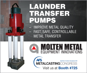 Advertisement | | MMEI’s Raptor transfer pump is the perfect solution to pump out your furnace, fill crucibles, ladles, or molds. It can be used for aluminum and zinc. The Raptor is lightweight, and mobile, making it easy to move around your plant.
