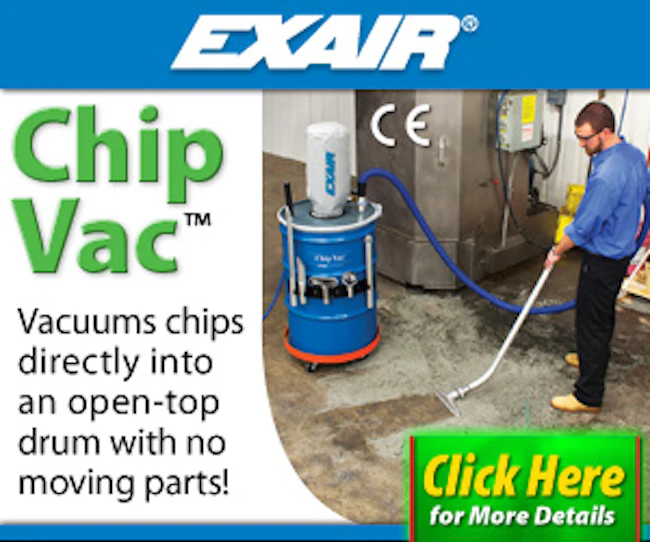 | | Sponsored | | Vacuums chips directly into an open-top drum with no moving parts! Chip Vac picks up chips from fixtures, floors and work surfaces of machining centers, lathes, saws, mills and other equipment and delivers them directly to an ordinary open-top drum. |